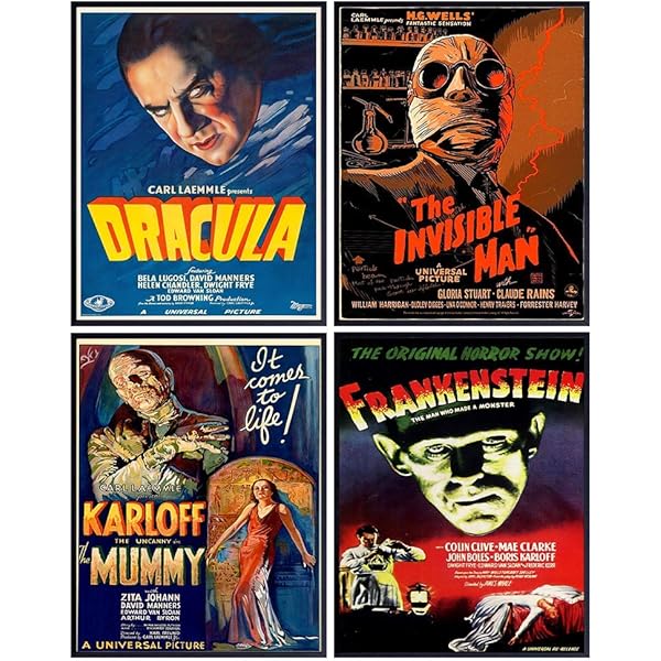 Amazon Com Dracula The Invisible Man The Mummy Frankenstein Vintage Horror Monster Movie Poster Set Home Theater Wall Art Decorations Creepy Classic Scary Movie Man Cave